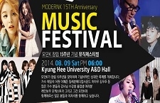 모던K 창립 15주년 기념 뮤직페스티벌 에일리 지나 더원 마마무 이예준 일레븐메디컬사운드 김우주 등 참여 2014. 08. 09 Sat. PM 06:00 경희대학교 국제캠퍼스 A&D 홀 Coming Soon