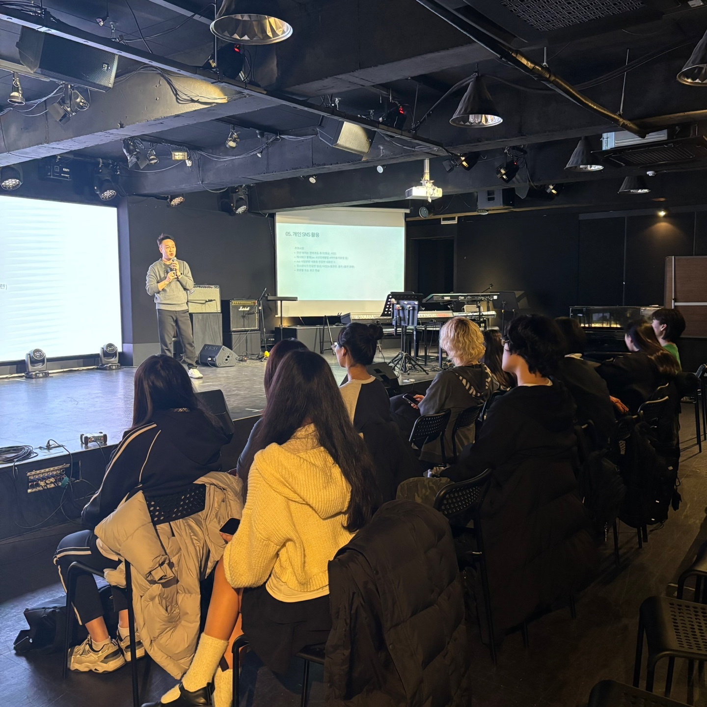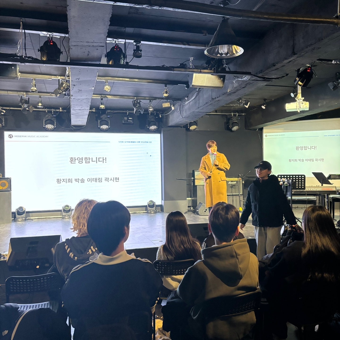 특강에 앞서 지희 학생의 오픈스테이지 무대와 오디션 예비반에서 승급한 학생들의 소개가 있었는데요,