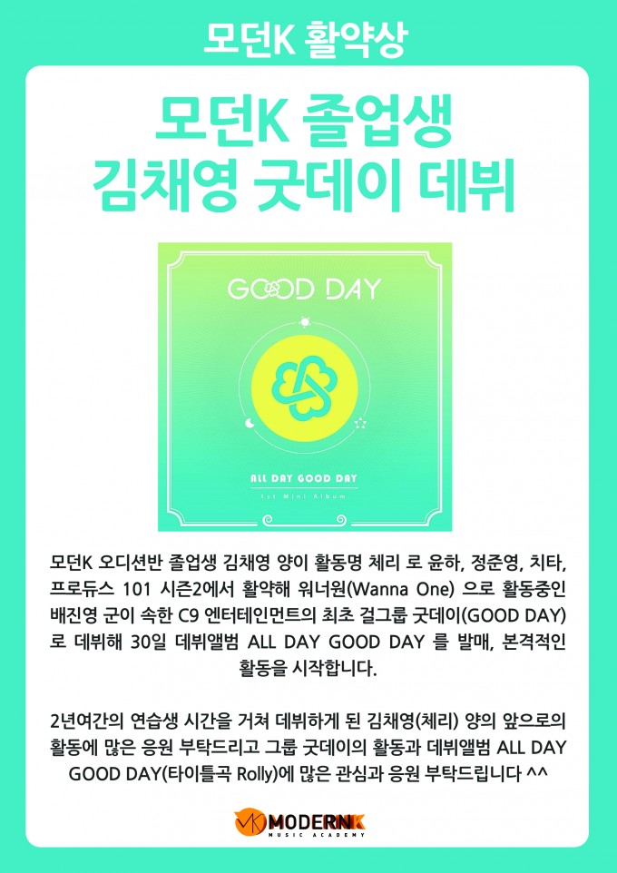 모던K 오디션반 졸업생 김채영 양이 활동명 체리 로 윤하, 정준영, 치타, 프로듀스 101 시즌2에서 활약해 워너원(Wanna One) 으로 활동중인 배진영 군이 속한 C9 엔터테인먼트의 최초 걸그룹 굿데이(GOOD DAY) 로 데뷔해 30일 데뷔앨범 ALL DAY GOOD DAY 를 발매, 본격적인 활동을 시작합니다.