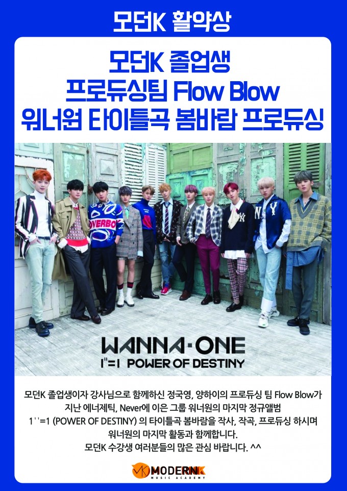 모던K 졸업생이자 강사님으로 함께하신 정국영, 양하이의 프로듀싱 팀 Flow Blow가 지난 에너제틱, Never에 이은 그룹 워너원의 마지막 정규앨범 1¹¹=1 (POWER OF DESTINY) 의 타이틀곡 봄바람을 작사, 작곡, 프로듀싱 하시며 워너원의 마지막 활동과 함께합니다. 모던K 수강생 여러분들의 많은 관심 바랍니다. ^^