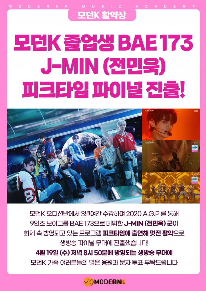 모던K 오디션반에서 3년여간 수강하며 2020 A.G.P 를 통해 9인조 보이그룹 BAE 173으로 데뷔한 J-MIN (전민욱) 군이