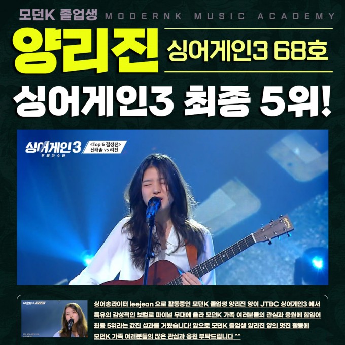 싱어송라이터 leejean 으로 활동중인 모던K 졸업생 양리진 양이 JTBC 싱어게인3 에서 특유의 감성적인 보컬로 파이널 무대에 올라 모던K 가족 여러분들의 관심과 응원에 힘입어 최종 5위라는 값진 성과를 거뒀습니다!