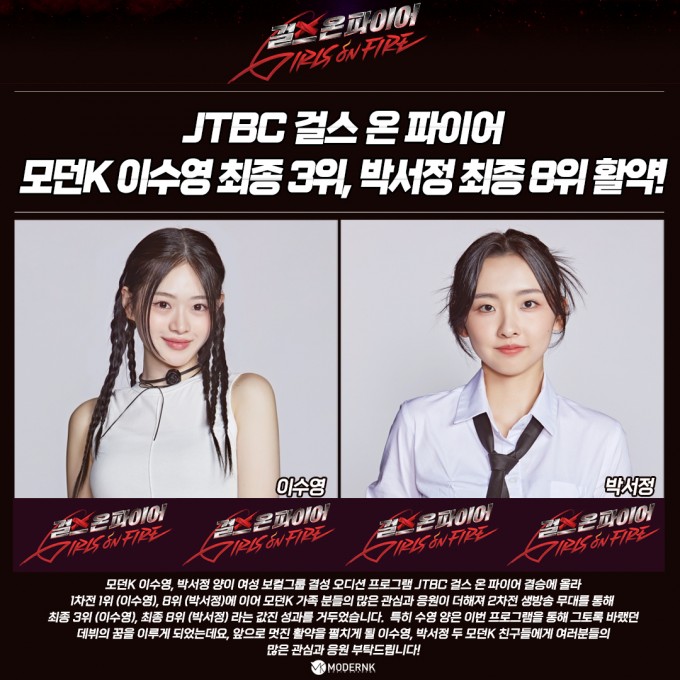 모던K 이수영, 박서정 양이 여성 보컬그룹 결성 오디션 프로그램 JTBC 걸스 온 파이어 결승에 올라 1차전 1위 (이수영), 8위 (박서정)에 이어