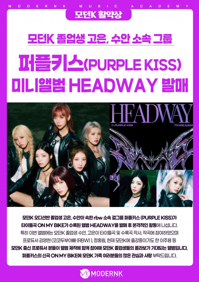 모던K 오디션반 졸업생 고은, 수안이 속한 rbw 소속 걸그룹 퍼플키스 (PURPLE KISS)가 타이틀곡 ON MY BIKE가 수록된 앨범 HEADWAY를 발매 후 본격적인 활동에 나섭니다. 특히 이번 앨범에는 모던K 졸업생 수안, 고은이 타이틀곡 및 수록곡 작사, 작곡에 참여하였으며 프로듀서 김영현 (코코두부아빠 (RBW) ), 정홍림, 현재 모던K에 출강중이기도 한 이주용 등 모던K 출신 프로듀서 분들이 앨범 제작에 함께 참여해 모던K 졸업생들의 콜라보가 기대되는 앨범입니다. 퍼플키스의 신곡 ON MY BIKE에 모던K 가족 여러분들의 많은 관심과 사랑 부탁드립니다.