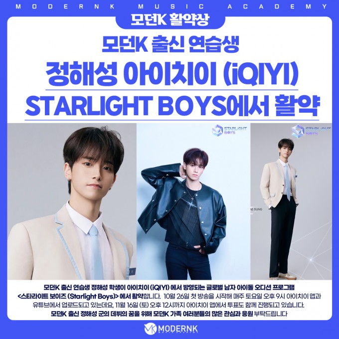 모던K 출신 연습생 정해성 학생이 아이치이 (iQIYI) 에서 방영되는 글로벌 남자 아이돌 오디션 프로그램 <스타라이트 보이즈 (Starlight Boys)> 에서 활약합니다.