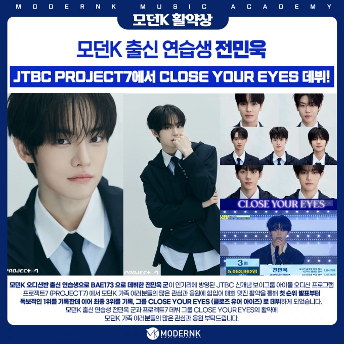 모던K 출신 연습생 전민욱 군과 프로젝트7 데뷔 그룹 CLOSE YOUR EYES의 활약에 모던K 가족 여러분들의 많은 관심과 응원 부탁드립니다.