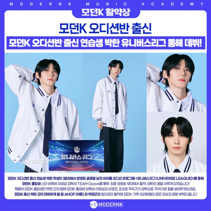 모던K 오디션반 출신 연습생 박한 학생이 SBS에서 방영된 글로벌 남자 아이돌 오디션 프로그램 <유니버스리그 (UNIVERSE LEAGUE)> 를 통해 모던K 졸업생 스타 비투비 이창섭 감독의 TEAM Goove를 통해