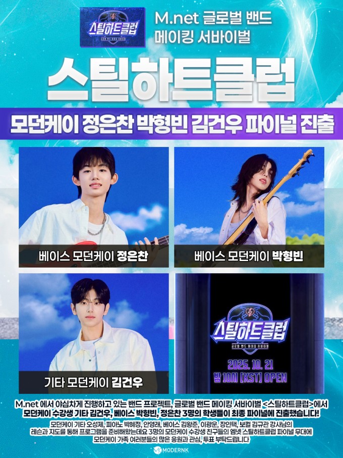 3명의 모던케이 수강생 친구들의 엠넷 스틸하트클럽 파이널 무대에 모던케이 가족 여러분들의 많은 응원과 관심, 투표 부탁드립니다