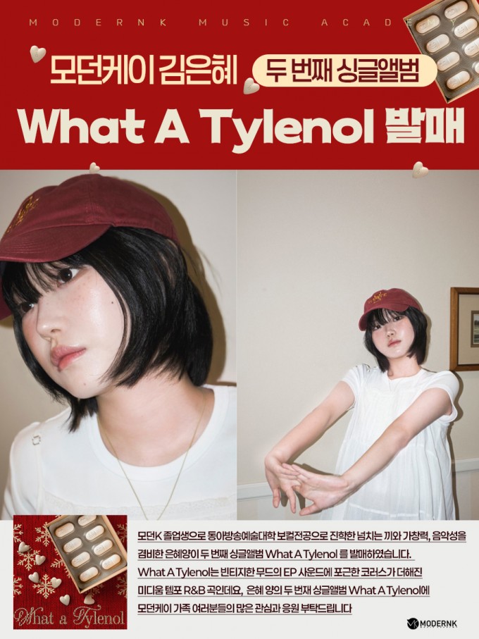 은혜 양의 두 번재 싱글앨범 What A Tylenol에 모던케이 가족 여러분들의 많은 관심과 응원 부탁드립니다