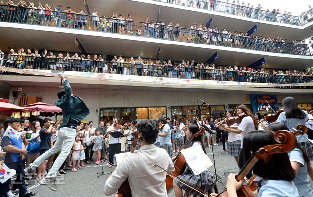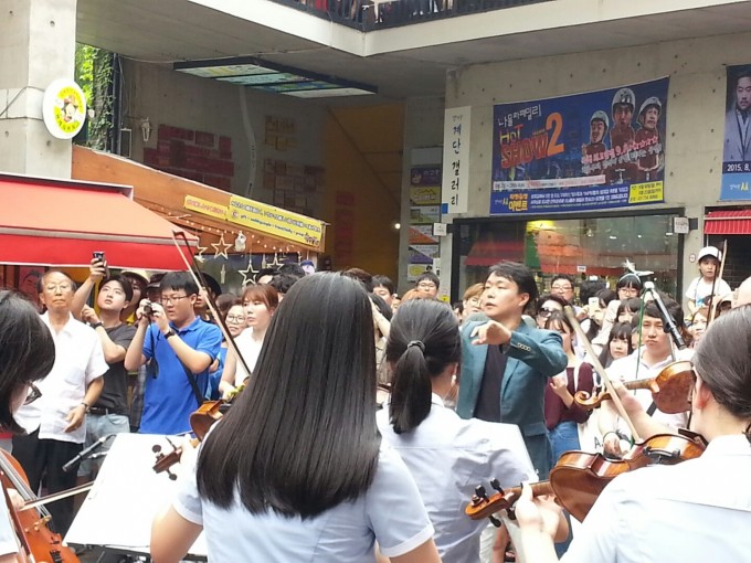 8월 16일 일요일 4시 모던K와 서울대학교 멘토링 모임 가이드러너의 기획하에 대진고, 대진여고 40여명의 오케스트라가 함께한 광복 70주년 기념 인사동 쌈지길 플래시몹 현장.