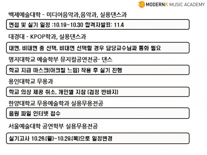 2021학년도 국내 K-POP, 실용댄스 수시 변동 및 특이사항 (2020년 10월 7일 Ver.)