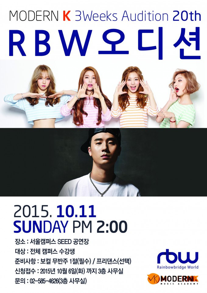 rbw 엔터테인먼트 오디션이 10월11일(일)에 진행됩니다.