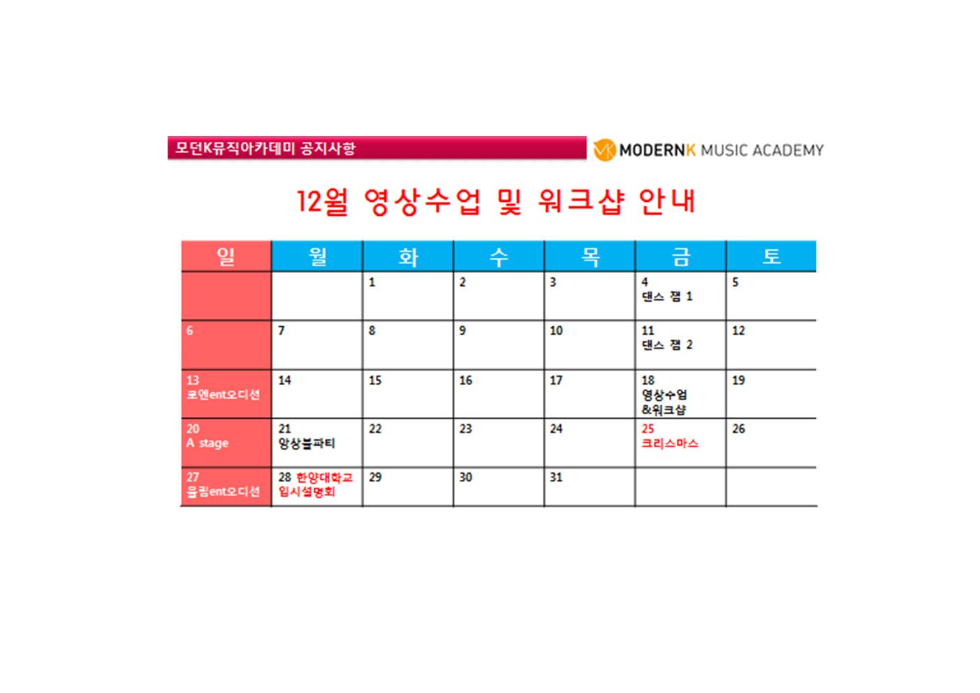 12월 오디션반 영상수업 & 워크샵 일정