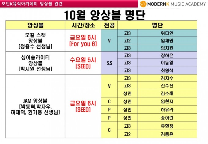 영통캠퍼스 10월 앙상블 명단입니다. 확인 후 결석 및 지각에 주의해주세요.