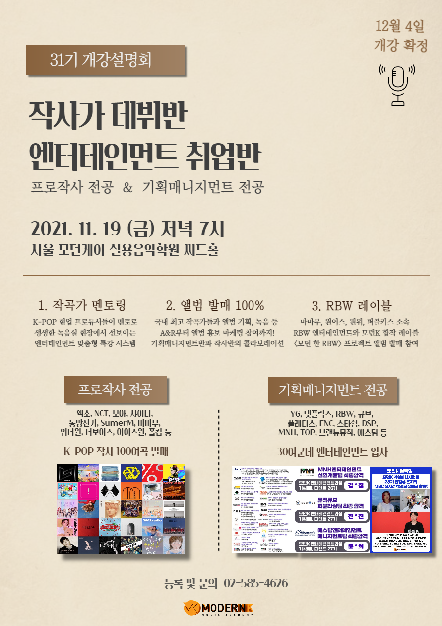 작사가 데뷔 지망생, 엔터테인먼트 취업 준비생을 위한 엔터테인먼트 과정 31기 개강 설명회가 열립니다.