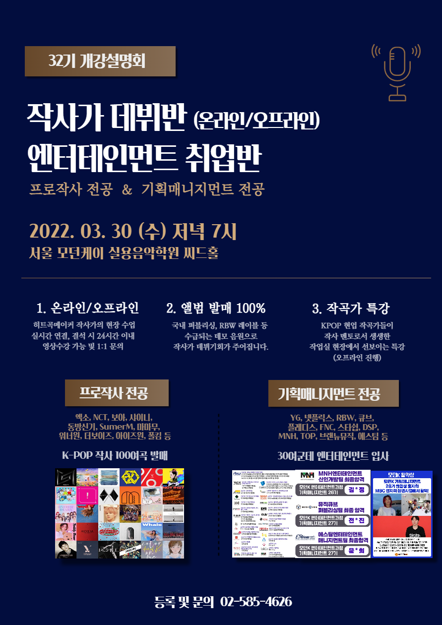 엔터테인먼트 취업 준비생을 위한 엔터테인먼트 과정 32기 개강 설명회가 열립니다.