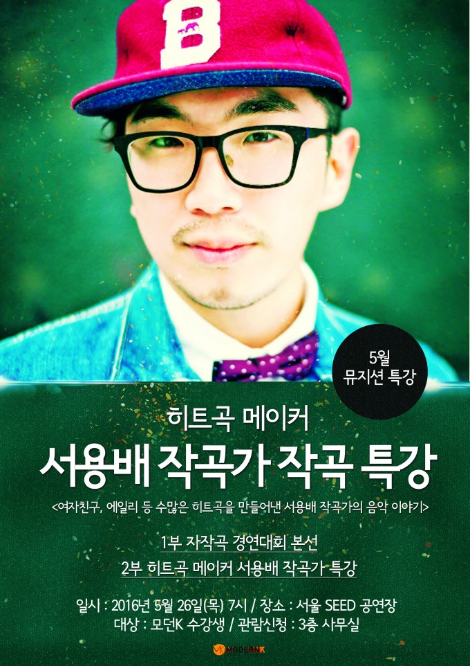 5월26일(목) 오후 7시 모던K 서울캠퍼스 SEED 공연장에서 여자친구, 에일리 등 요즘 가장 핫한 작곡가 '서용배' 작곡가님의 특강이 진행됩니다.