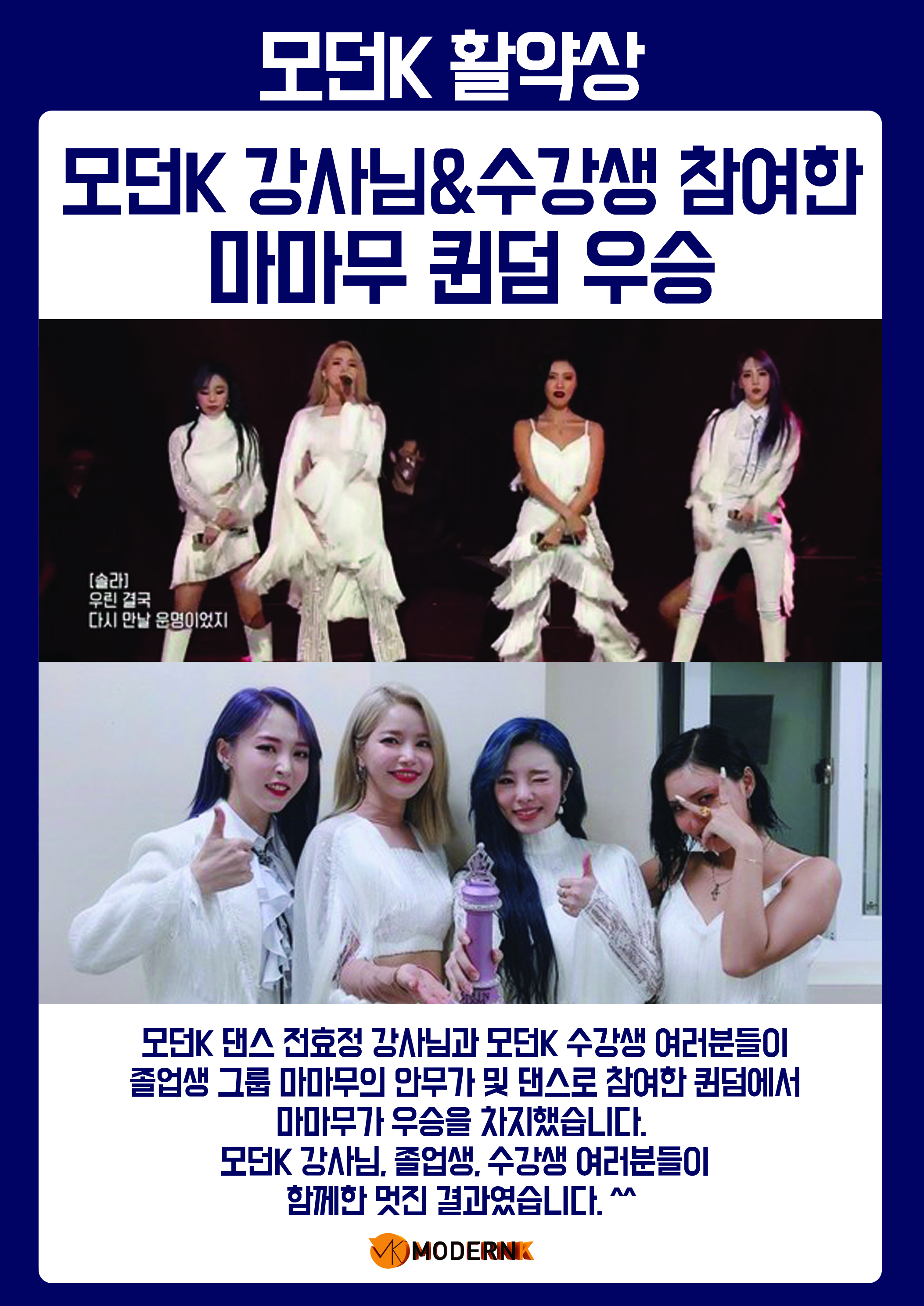 마마무가 우승을 차지했습니다. 모던k 강사님, 졸업생, 수강생 여러분들이 함께한 멋진 결과였습니다.