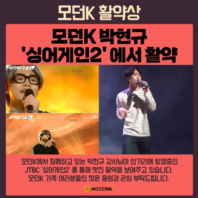 모던K에서 함께하고 있는 박현규 강사님이 인기리에 방영중인 JTBC '싱어게인2' 를 통해 멋진 활약을 보여주고 있습니다.
