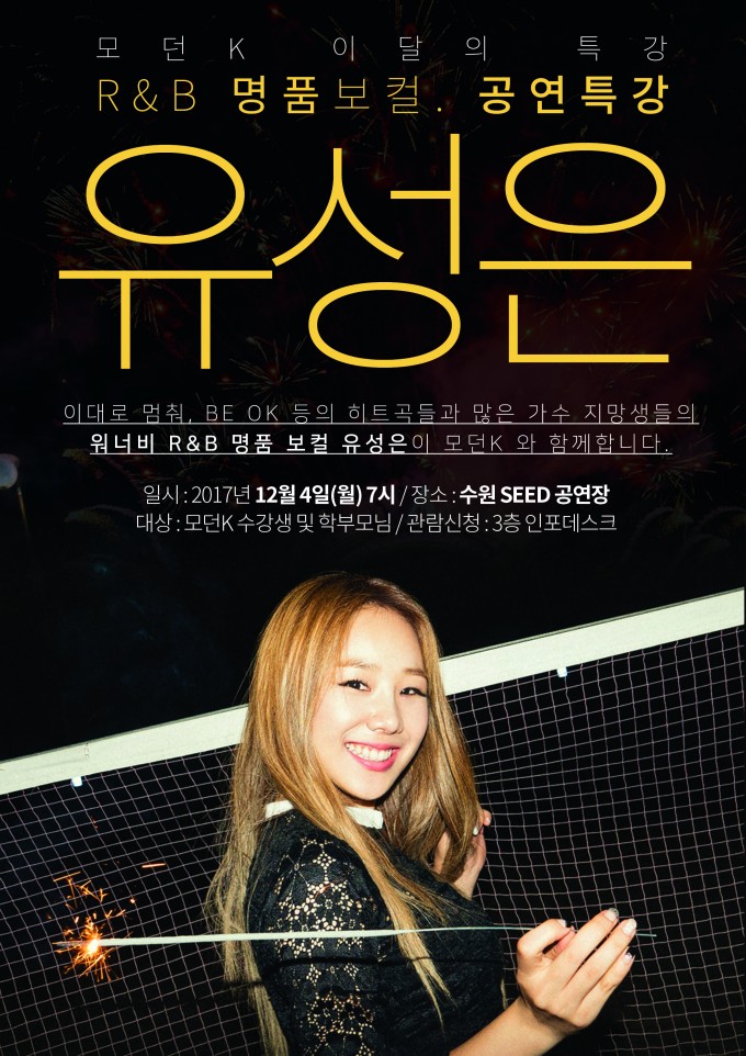 이대로 멈춰 Be OK 등의 히트곡들과 많은 가수 지망생들의 워너비 R&B 명품 보컬 유성은이 모던K 와 함께합니다.