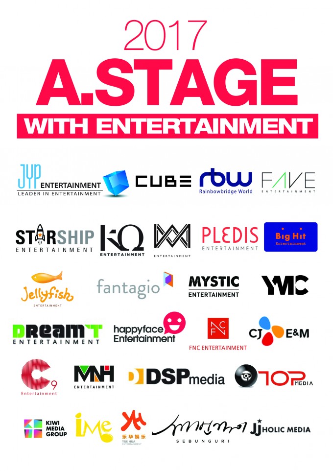 JYP, 큐브, rbw, 로엔 페이브, 스타쉽, KQ, WM, 플레디스, 빅히트, 젤리피쉬, 판타지오, 드림티, 미스틱, YMC, 해피페이스, FNC, C9, CJ E&M, 키위미디어그룹, MNH, DSP 미디어, TOP 미디어, IME KOREA, 위에화, 세번걸이, JJ홀릭미디어