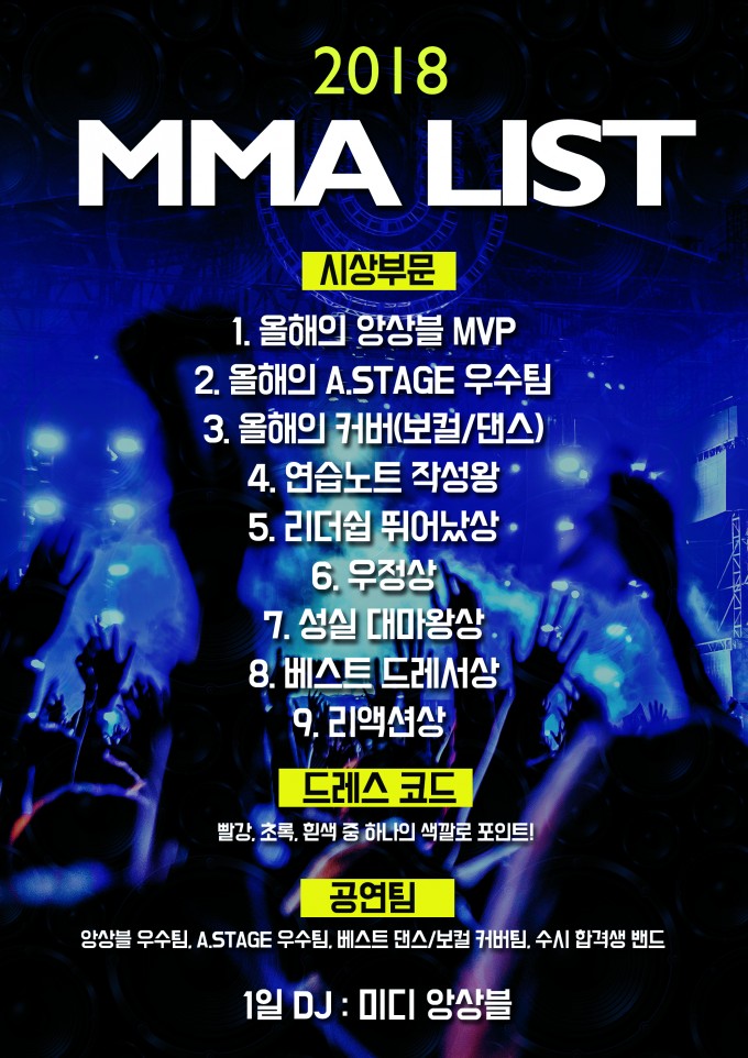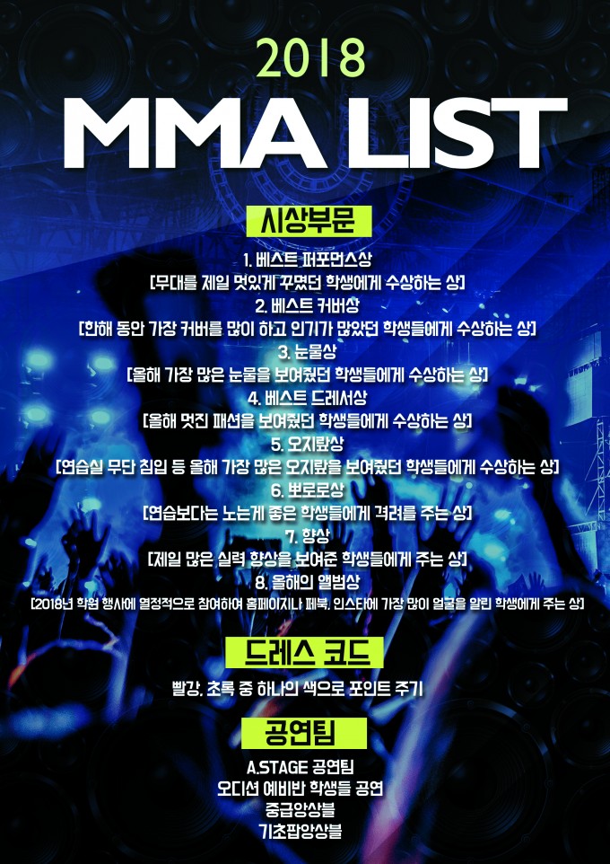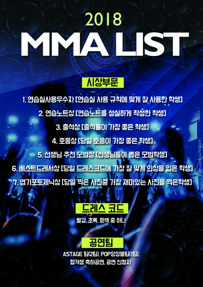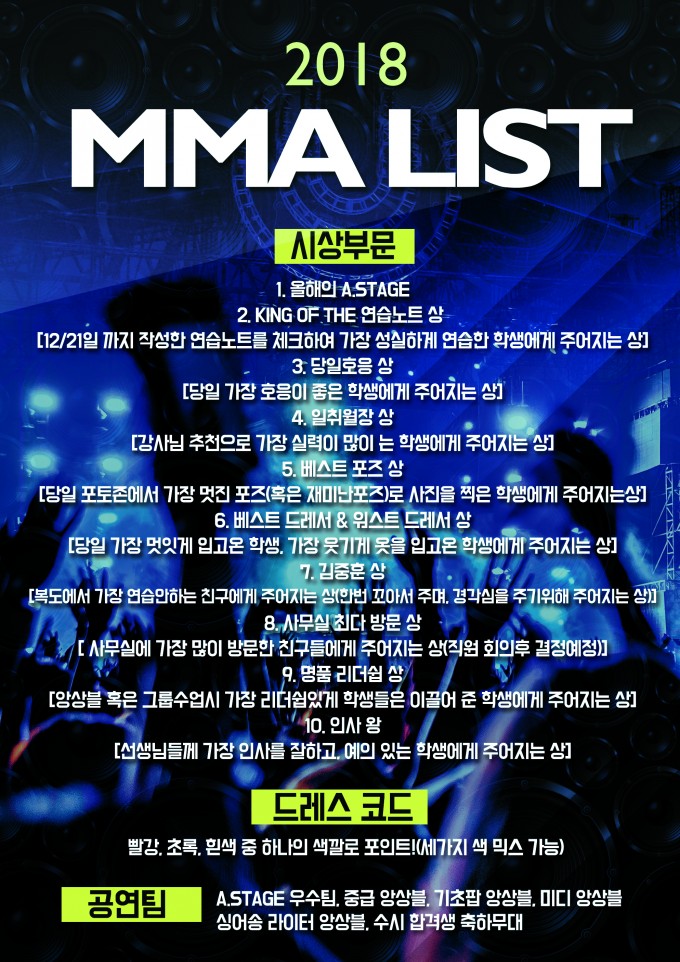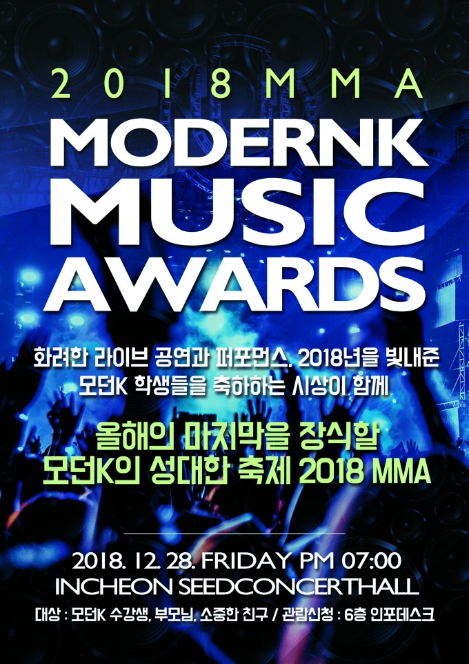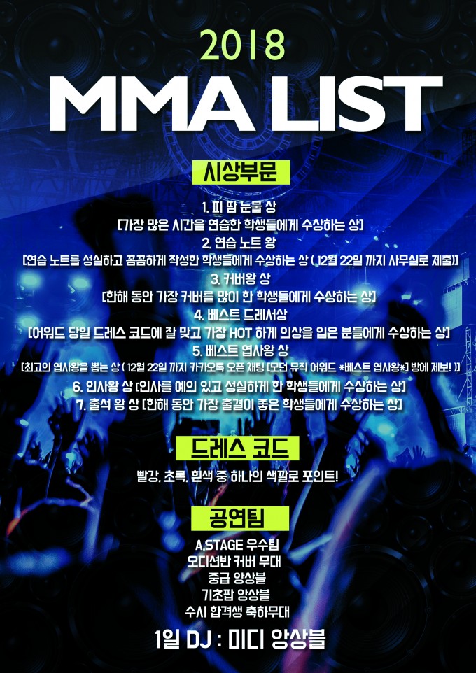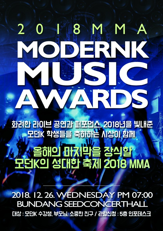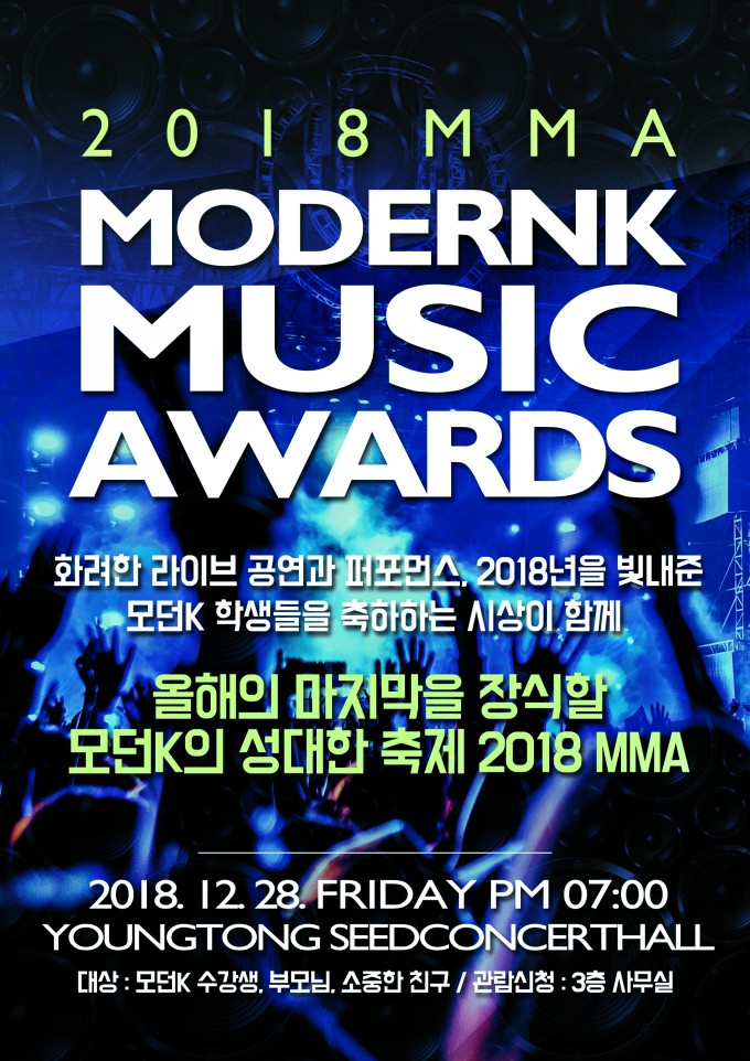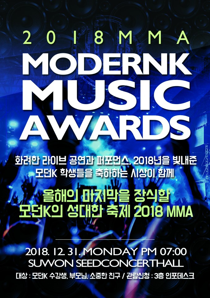 2018년 한해를 마무리하며 각자의 위치에서 최선을 다한 수강생 여러분들과 강사님, 직원 여러분들의 노고를 기리고 축하하기 위한 2018 MODERNK MUSIC AWARDS(이하 MMA) 가 열립니다. 한해를 마무리 하는 자리인 2018 MMA에 많은 관심과 성원 부탁드립니다. 모두 올 한해 수고하셨습니다 ^^