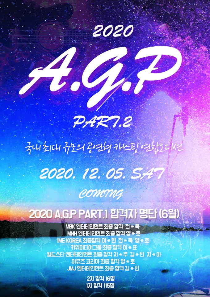 40~50여개 엔터테인먼트가 참여하는 국내 최대 규모의 공연형 캐스팅 연합 오디션 2020 A.G.P Part.2 가 12월 첫주를 목표로 현재 팀 구성을 마치고 본격적인 준비를 시작합니다.