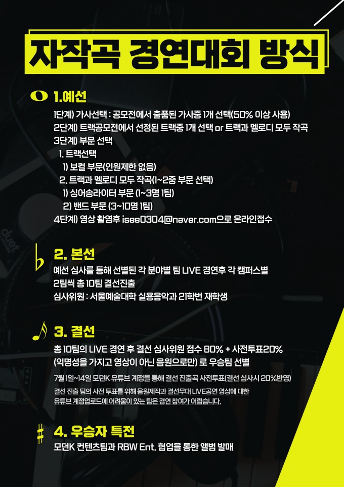- 우승팀의 곡은 모던K 컨텐츠팀과 함께 제작하는 앨범발매가 진행됩니다.