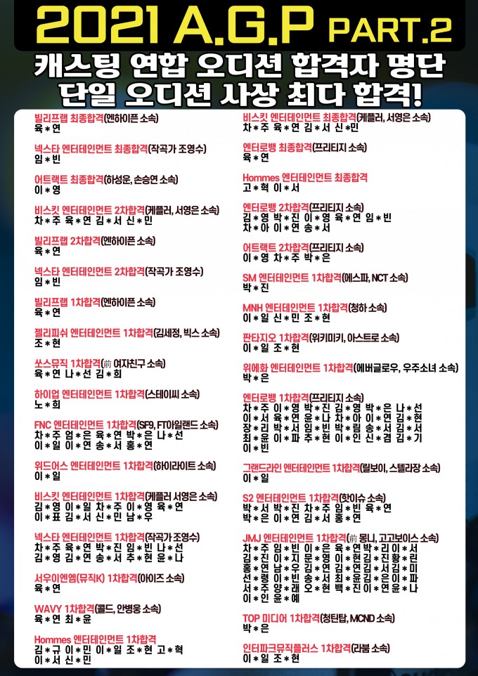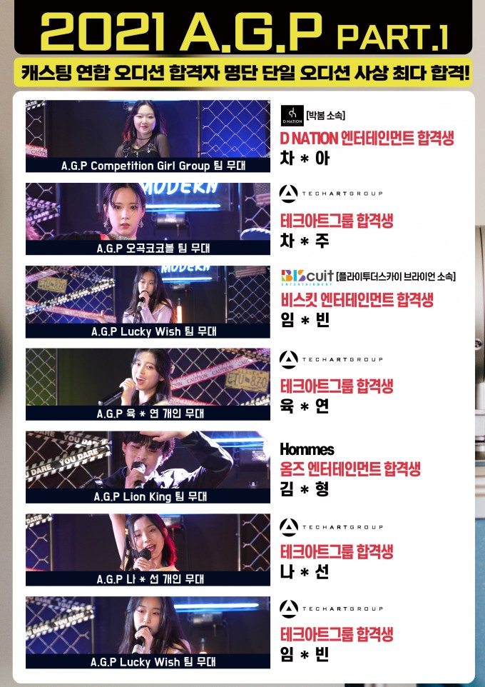 50여개의 엔터테인먼트 신인개발팀에서 참여해 캐스팅이 진행되는 이번 A.G.P 는 여러분들께 최고의 기회가 될 것입니다!