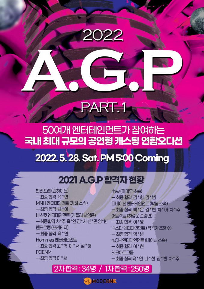 국내 최대 규모의 공연형 캐스팅 연합 오디션인 2022 A.G.P PART.1이 5월 28일(토) 5시에 열립니다!