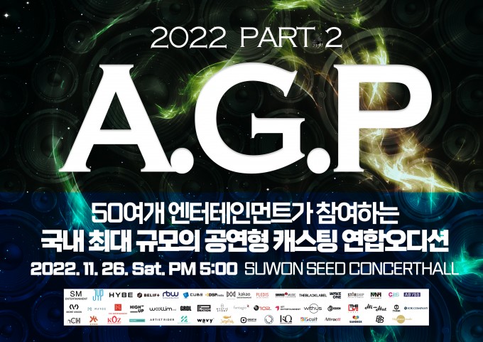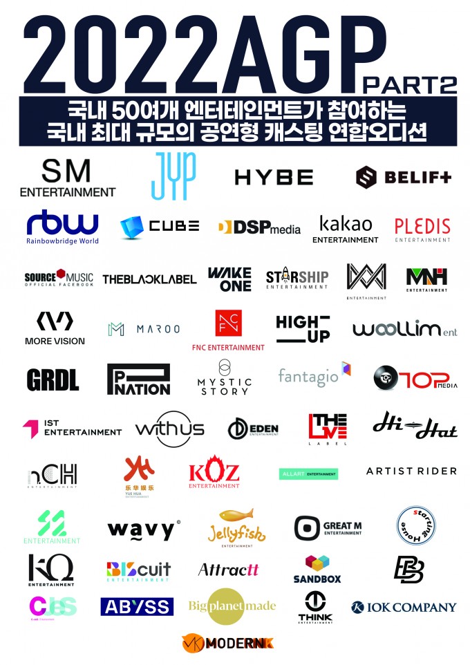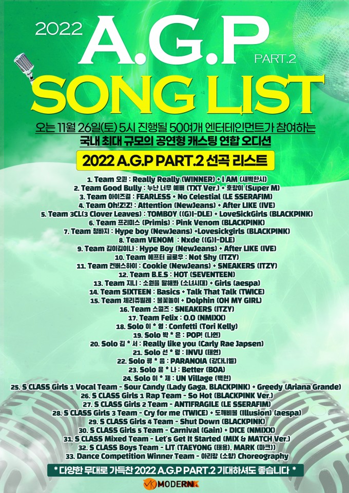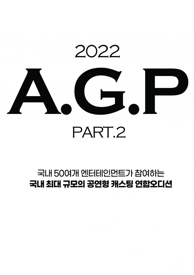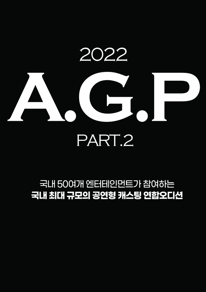 A.G.P 란? : 국내 최초로 모던K에서 고안한 국내 다수 (50~60개) 의 기획사가 참여해 캐스팅을 진행하는 공연 형태의 캐스팅 연합오디션으로 '실력' '인성' '포지션' '자기관리' 등 모던K 만의 특화된 교육과 컨설팅을 통해 팀을 편성, 4개월간 컨셉 및 선곡 선정, 보컬, 댄스 점검, 녹음, 프로필 촬영 등 주차별 커리큐럼에 맞춰 최고의 무대를 준비합니다. 단 3~4분의 무대를 통해 50개 기획사의 캐스팅 기회가 주어지며, 각 엔터테인먼트 신인개발팀에서는 그 무대를 통해 마치 각 지망생들의 데뷔 후 모습을 미리 가늠하며 캐스팅을 진행할 수 있어 지난 20여년간 많은 기획사에 최고의 캐스팅 기회를 제공해왔습니다.