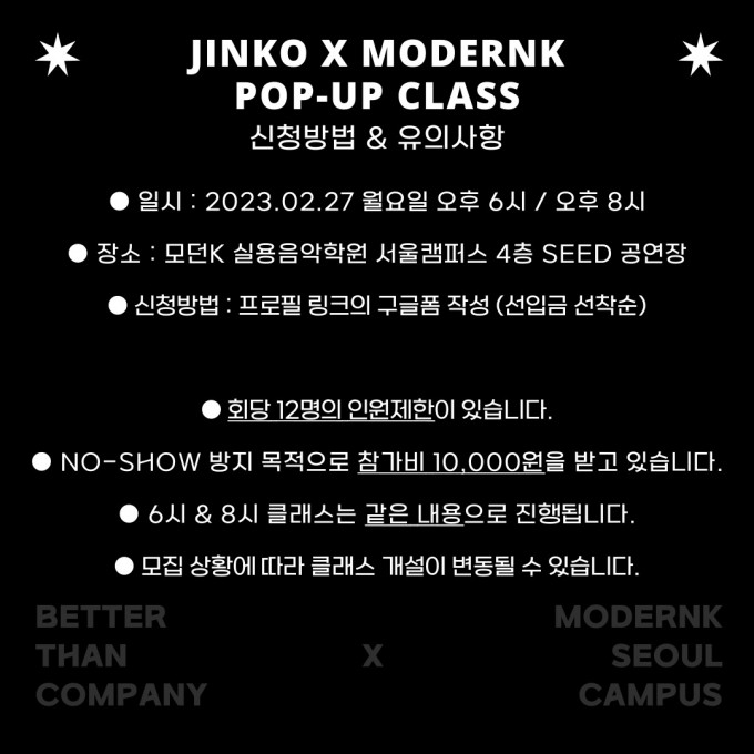 댄서 JINKO @jin_ko.__ 의 팝업클래스가 모던K 실용음악학원 서울캠퍼스에서 열립니다!