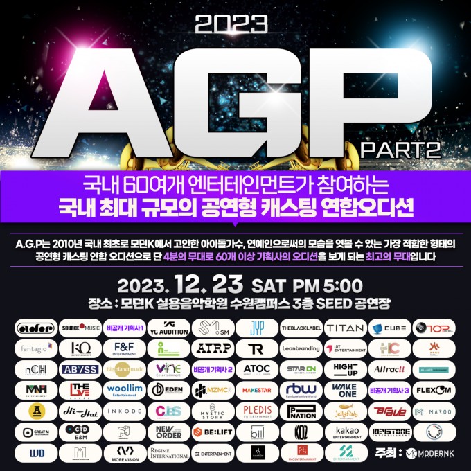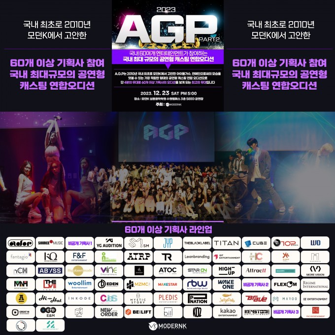 60개 이상 기획사가 참여하는 국내 최대 규모의 공연형 캐스팅 연합 오디션 2023 A.G.P PART.2 (Audition class Group Performance)이 12월 23일 (토) 5시 모던K 수원캠퍼스 SEED 공연장에서 열립니다!
