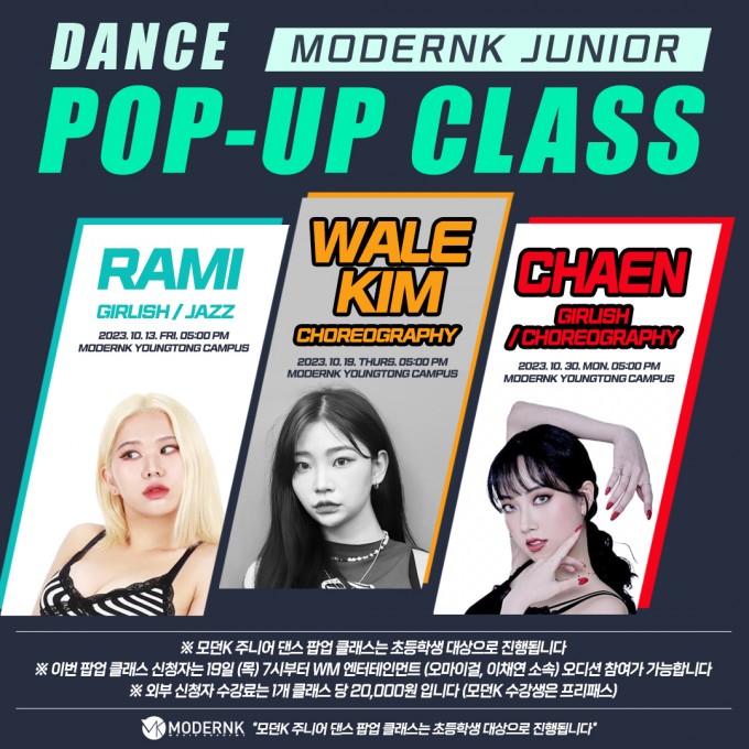 GIRLISH / CHOREOGRAPHY / JAZZ 를 주장르로 활발히 활동중이신 댄서 RAMI, 댄서 WALE KIM, 댄서 CHAEN 의 주니어 팝업 클래스가 모던K 영통캠퍼스에서 열립니다!