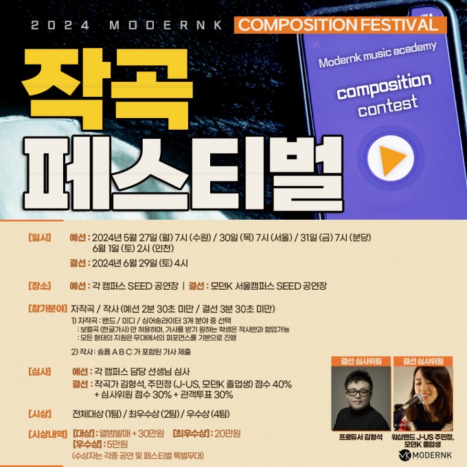 심사 [예선] 각 캠퍼스 담당 선생님 심사 [결선] 작곡가 김형석, 주민정 (J-US 멤버, 모던K 졸업생) 점수 40% + 심사위원 점수 30% + 관객투표 30%