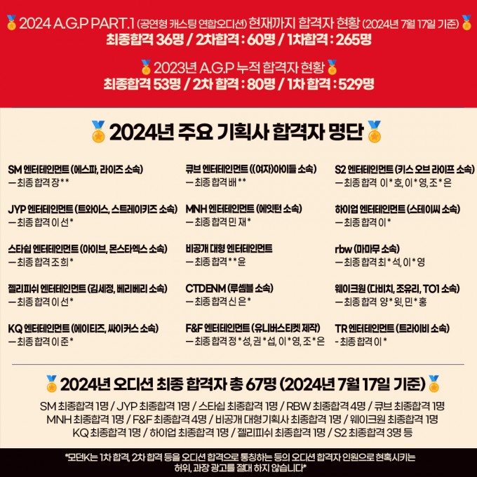 2024 A.G.P PART.1 (공연형 캐스팅 연합오디션) 현재까지 합격자 현황 (2024년 7월 17일 기준)