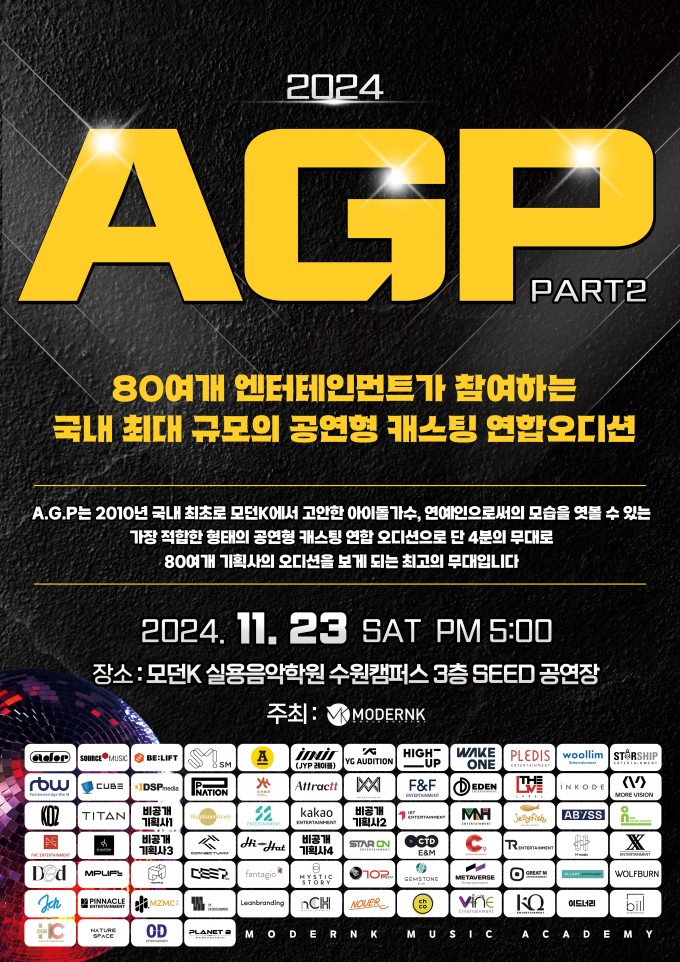 80여개 기획사가 참여하는 국내 최대 규모의 공연형 캐스팅 연합 오디션 2024 A.G.P PART.2 (Audition class Group Performance)가 11월 23일 (토) 5시 모던K 수원캠퍼스 SEED 공연장에서 열립니다!