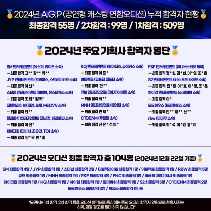 2024년 A.G.P (공연형 캐스팅 연합오디션) 누적 합격자 현황