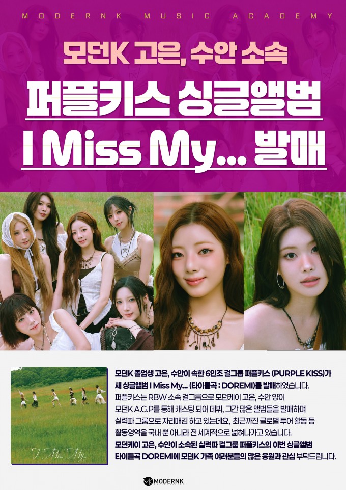 모던K 졸업생 고은, 수안이 속한 6인조 걸그룹 퍼플키스 (PURPLE KISS)가 새 싱글앨범 I Miss My... (타이틀곡 : DOREMI)를 발매하였습니다.