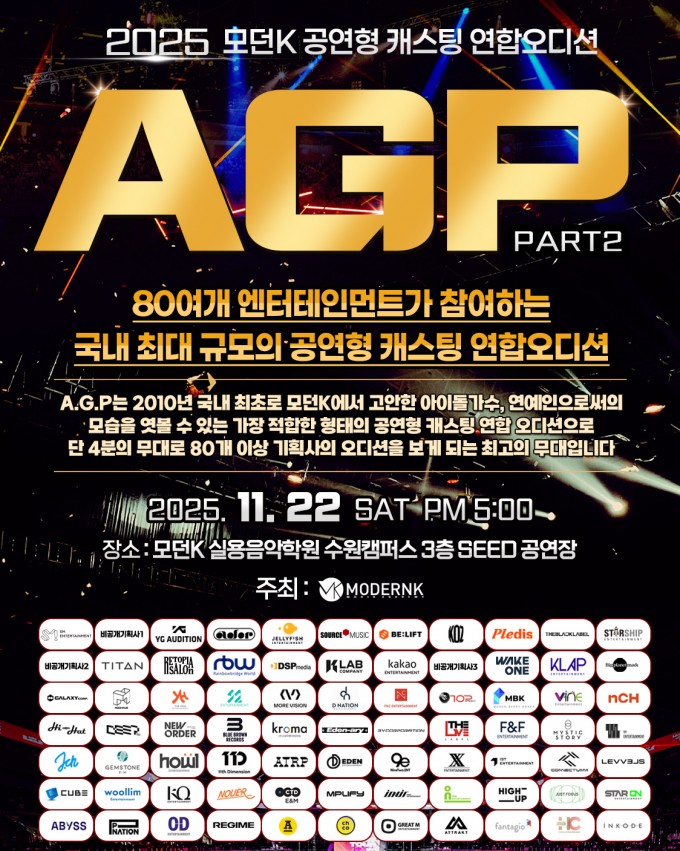 80여개 기획사가 참여하는 국내 최대 규모의 공연형 캐스팅 연합 오디션 2025 A.G.P PART.2 (Audition class Group Performance)가 11월 22일 (토) 5시 모던K 수원캠퍼스 SEED 공연장에서 열립니다!
