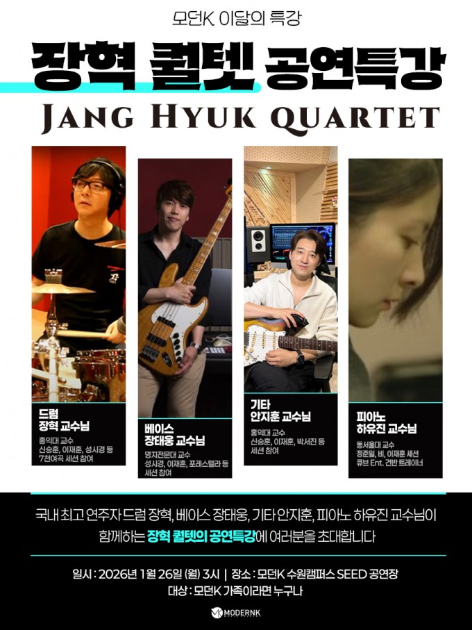 국내 최고 연주자 드럼 장혁, 베이스 장태웅, 기타 안지훈, 피아노 하유진 교수님이 함께하는