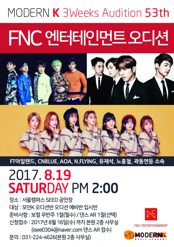 모던K 3Weeks Audition 53th FNC 엔터테인먼트 오디션 FT아일랜드 CNBLUE AOA N.Flying 유재석 노홍철 곽동연 등 소속