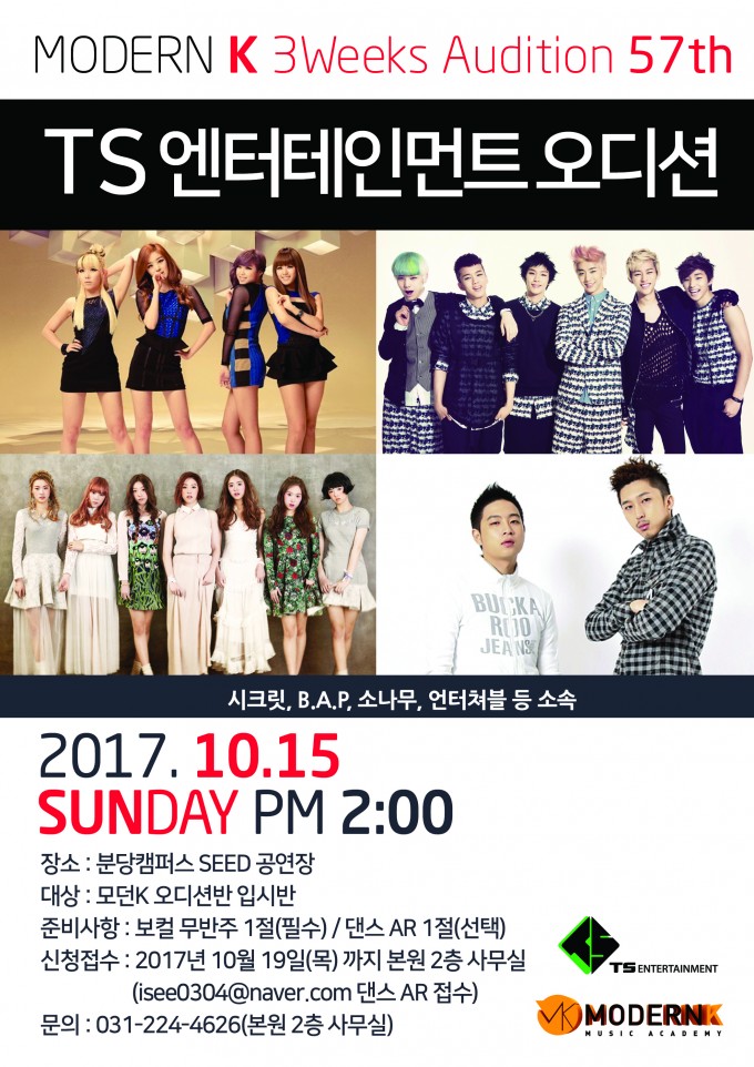 모던K 3Weeks Audition 57th TS 엔터테인먼트 오디션 시크릿 B.A.P 소나무 언터쳐블 등 소속