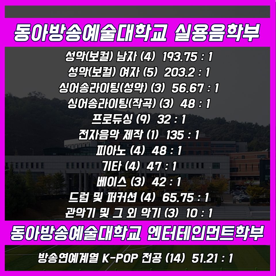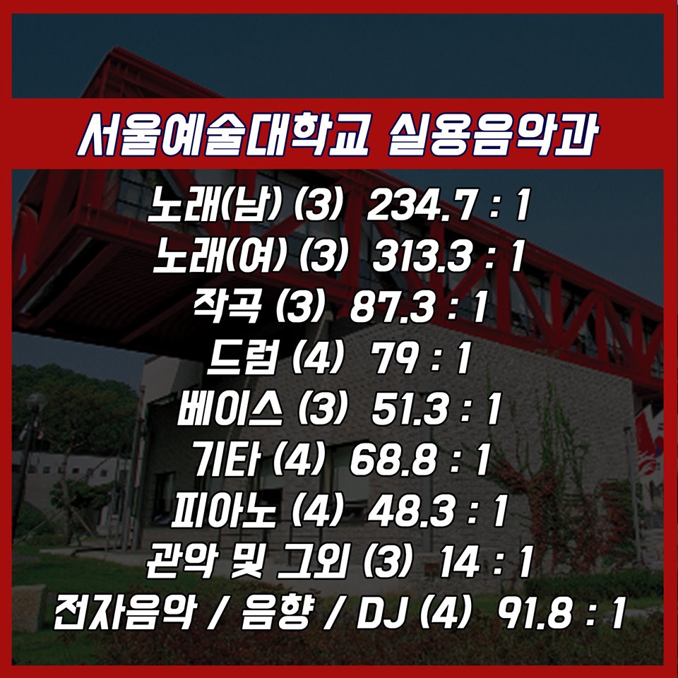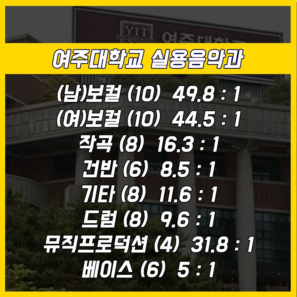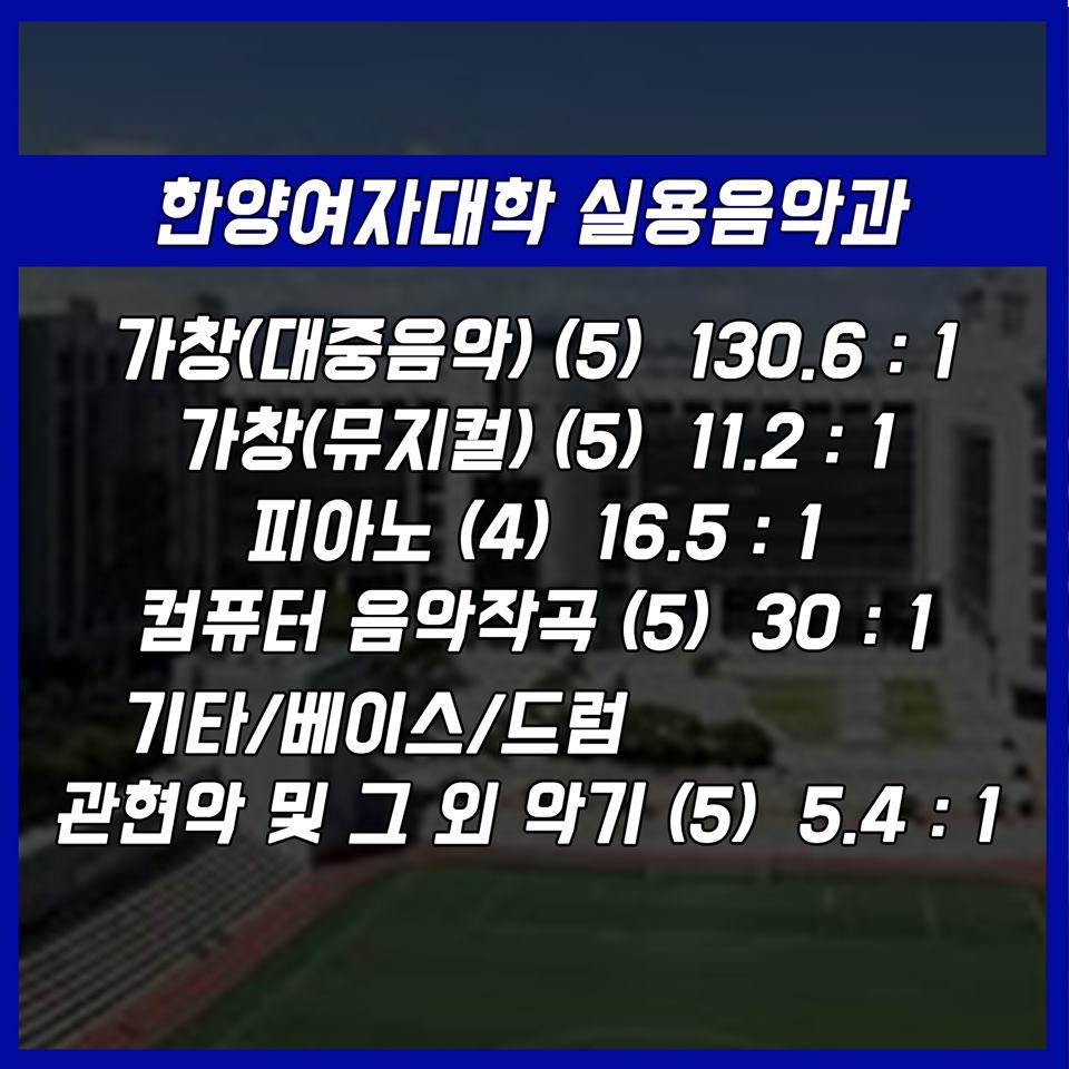 #실용음악과 #실음과 #수시 #입시 #수시경쟁률 #23년제경쟁률 #실용음악과4년제 #실용음악과경쟁률 #경쟁률 #서울예대 #서울예술대학교 #동아방송예술대학교 #여주대학교 #한양여자대학교 #백석예술대학교 #장안대학교 #백석예대 #장안대 #명지전문대 #명지전문대학 #보컬 #드럼 #기타 #베이스 #작곡 #건반 #재즈피아노 #피아노 #퍼커션 #타악기 #리듬 #KPOP #KPOP전공 #뮤직테크놀로지 #뮤직프로덕션 #관악 #DJ #전자음악 #음향