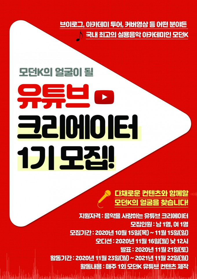 국내 최고의 실용음악 아카데미인 모던K의 다채로운 컨테츠와 함께할 모던K의 얼굴을 찾습니다!