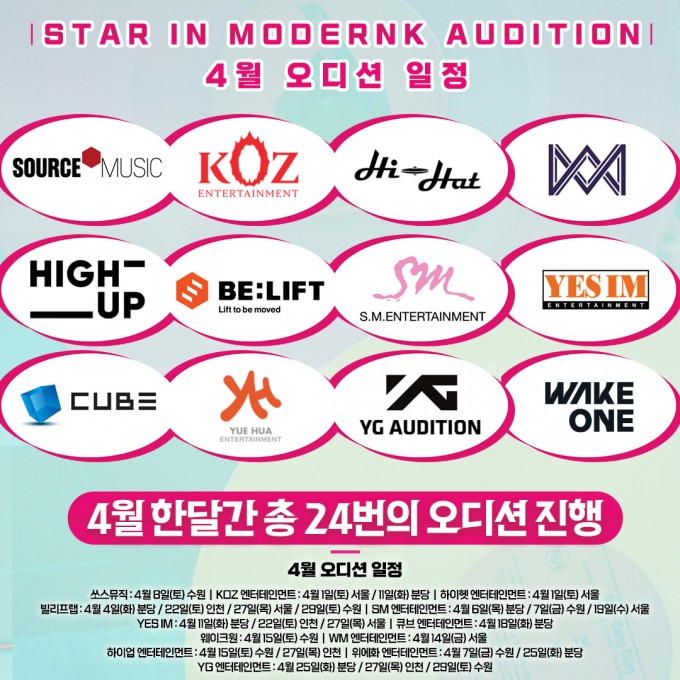 쏘스뮤직, KOZ, 하이헷, 빌리프랩, SM, YES IM, 큐브, 위에화, YG, 하이업, 웨이크원, WM 등 4월 한달간 총 24번의 오디션 진행!