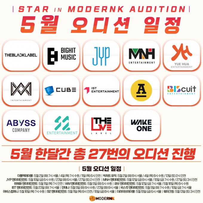더블랙레이블, 빅히트 뮤직, JYP, MNH, 위에화, WM, 큐브, IST, 안테나, 비스킷, 어비스컴퍼니, S2, 더라이브레이블, 웨이크원 등 5월 한달간 총 27번의 오디션 진행!