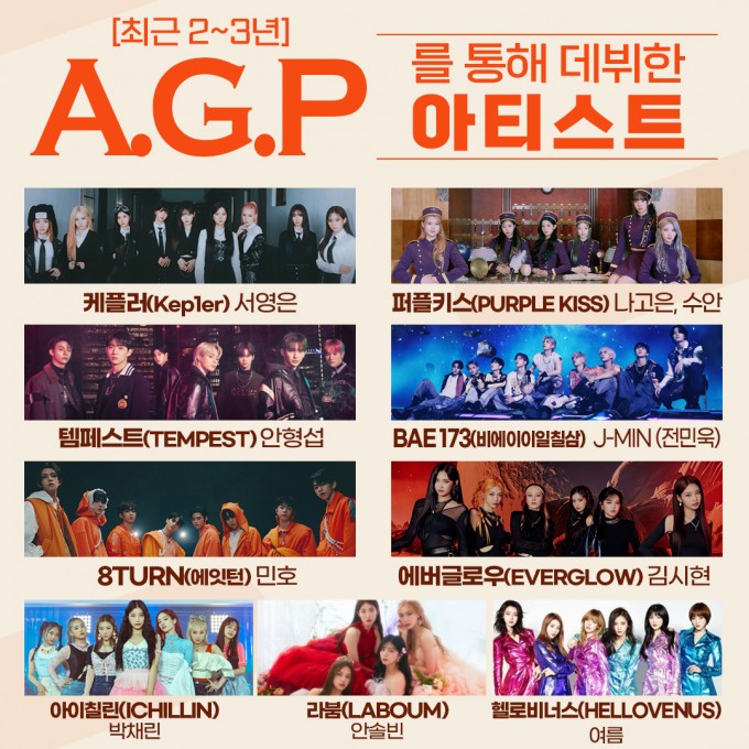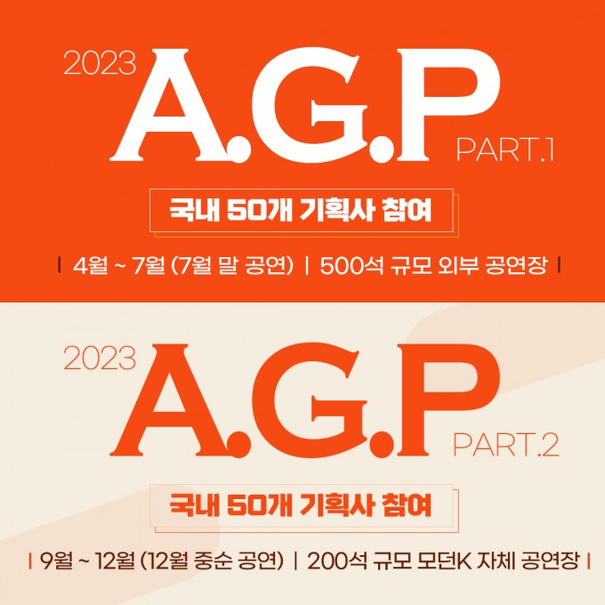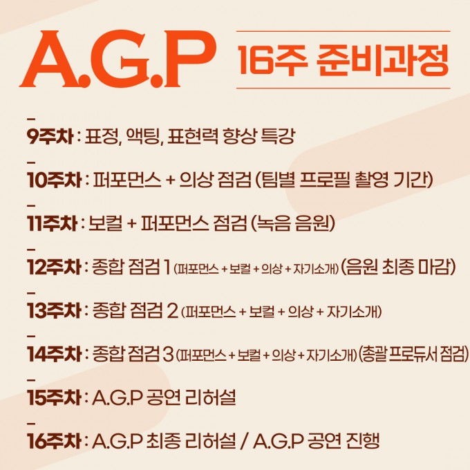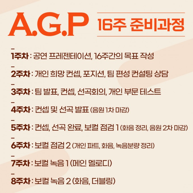 프로그램 : 1:1 보컬 개인레슨 (주 1회 1시간) (주 2, 3회 수업 가능) : 댄스 그룹레슨 (주 2회, 회당 1시간) (수업 추가, 개인레슨 가능) : 워크샵 수업 (주 1회 1시간) (개인, 그룹 미션, 오디션 컨설팅) : 월 15 - 20회 이상 내방 오디션 참여 가능 : 아이돌가수 지망생들에게 최고의 디렉팅을 통해 16주간 가수, 아이돌, 연예인으로써의 모습을 갖춰가는 공연형 캐스팅 연합오디션 2023 A.G.P Part.1 (4월 ~ 7월) / Part.2 (9월 ~ 12월) 연 2회 참여