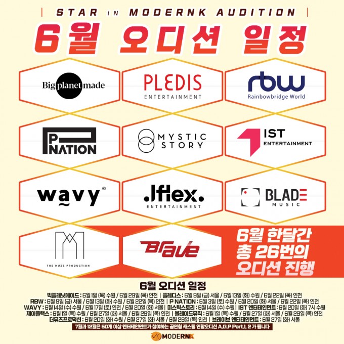 플레디스, RBW, 빅플래닛메이드, P NATION, 미스틱스토리, WAVY, IST, 브레이브 엔터테인먼트, 더뮤즈프로덕션, 제이플랙스, 블레이드뮤직 등 6월 한달간 총 26번의 오디션 진행!