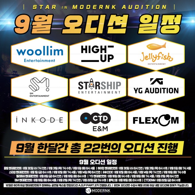 스타쉽, YG, SM, 울림, 하이업, 플렉스엠, CTDENM, 젤리피쉬, iNKODE 등 9월 한달간 총 22번의 오디션 진행!